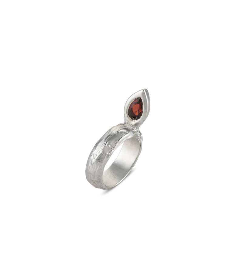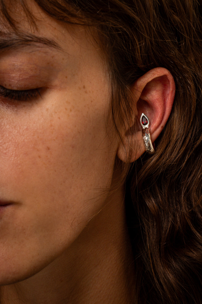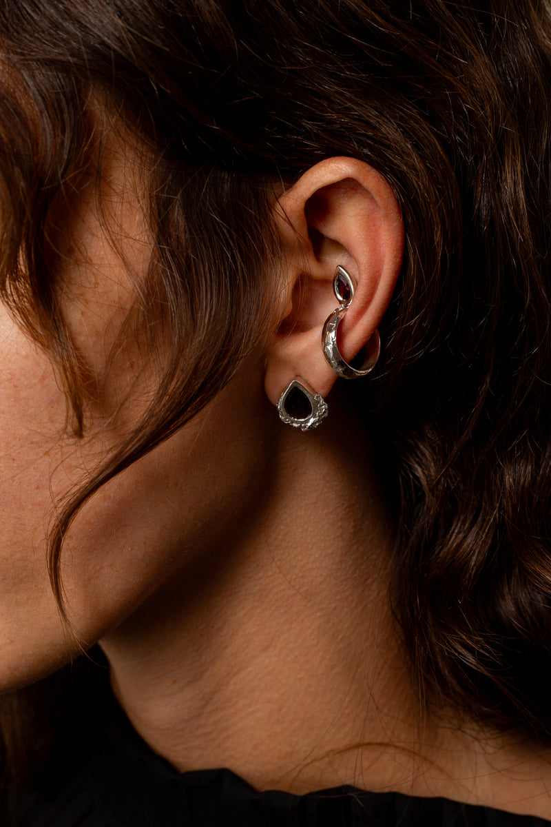 A true showstopper - whether worn as a singular expression piece or paired with other pieces, this ear cuff features a molten texture detailing along with small pear shaped red granet.