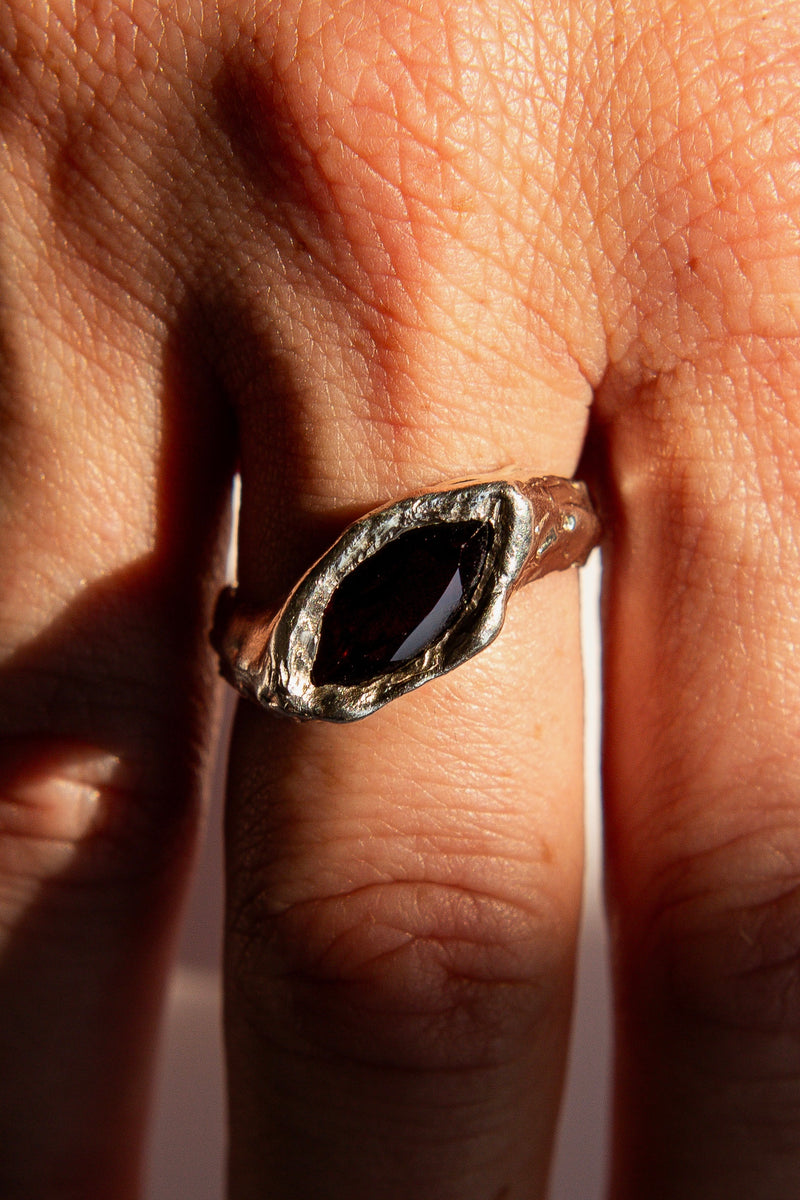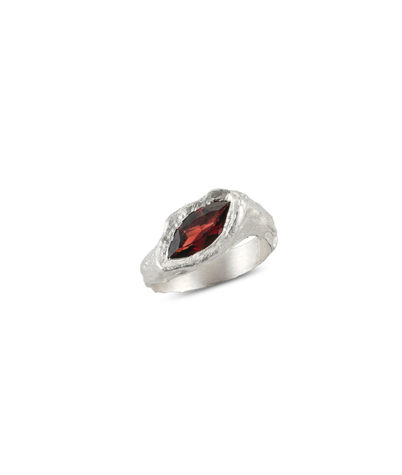 Asymmetric, deep molten texture ring set with marquise shaped red granet