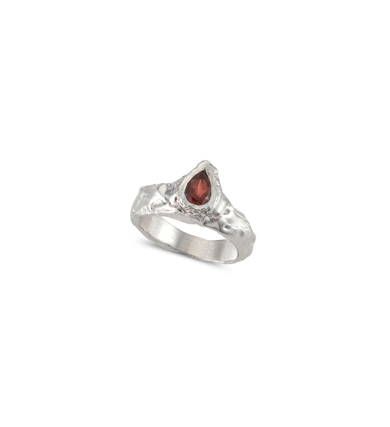 Delicate molten–texture ring set with a small pear-shaped red garnet.
