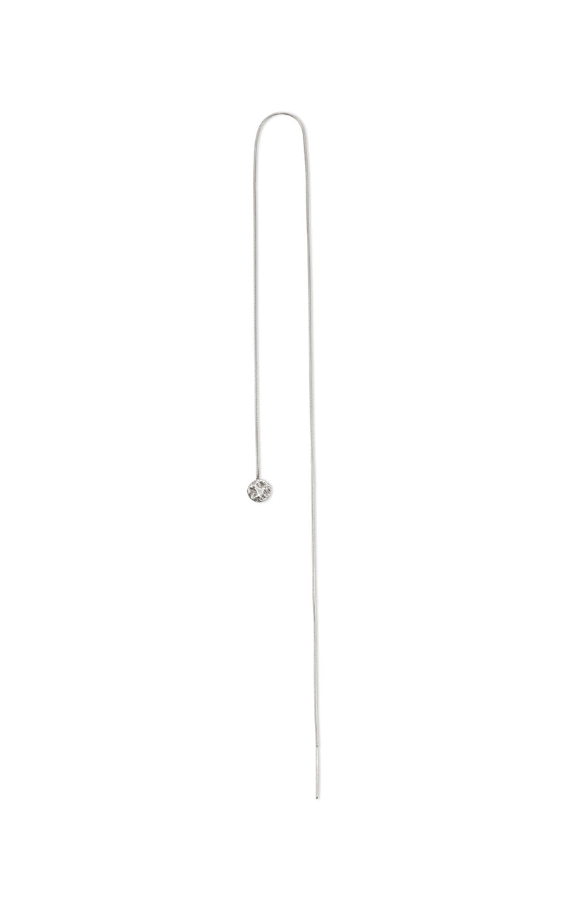 this earring features small, hand-carved textured silver stud attached to a fine chain, creating an elongated silhouette that shifts gently with motion