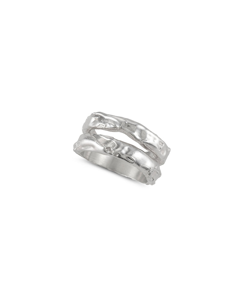 A double-band ring with a raw molten finish, hand-carved to create soft folds and organic depth.
