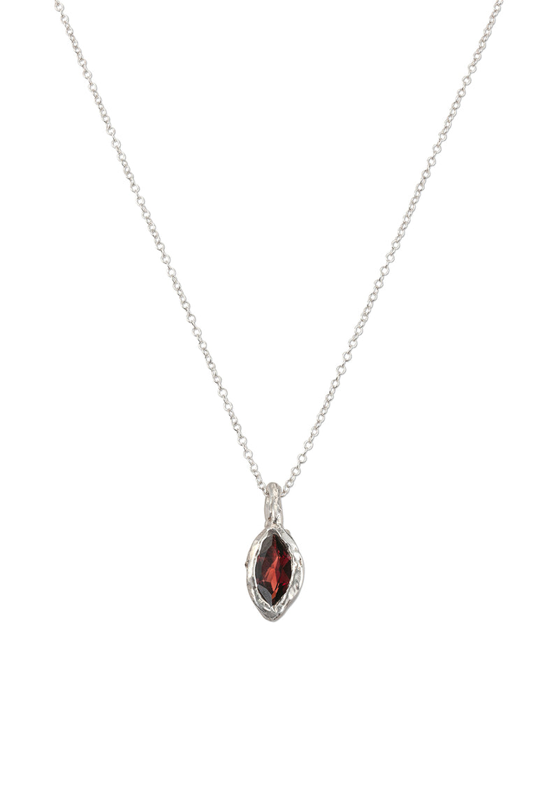 Pendant necklace featuring a deep red marquise-cut garnet, framed by a fully textured, hand-sculpted stone seat.