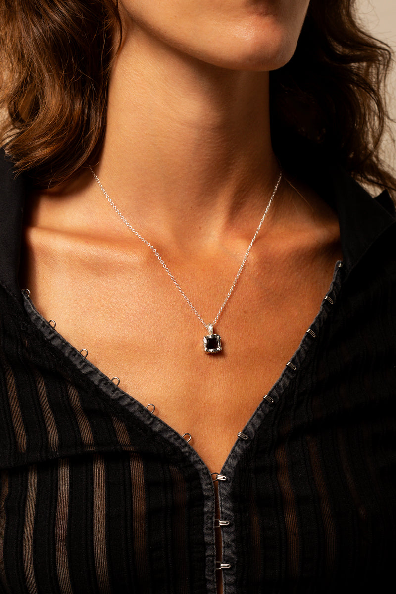Pendant necklace featuring a deep red square -cut garnet, framed by a fully textured, hand-sculpted stone seat.