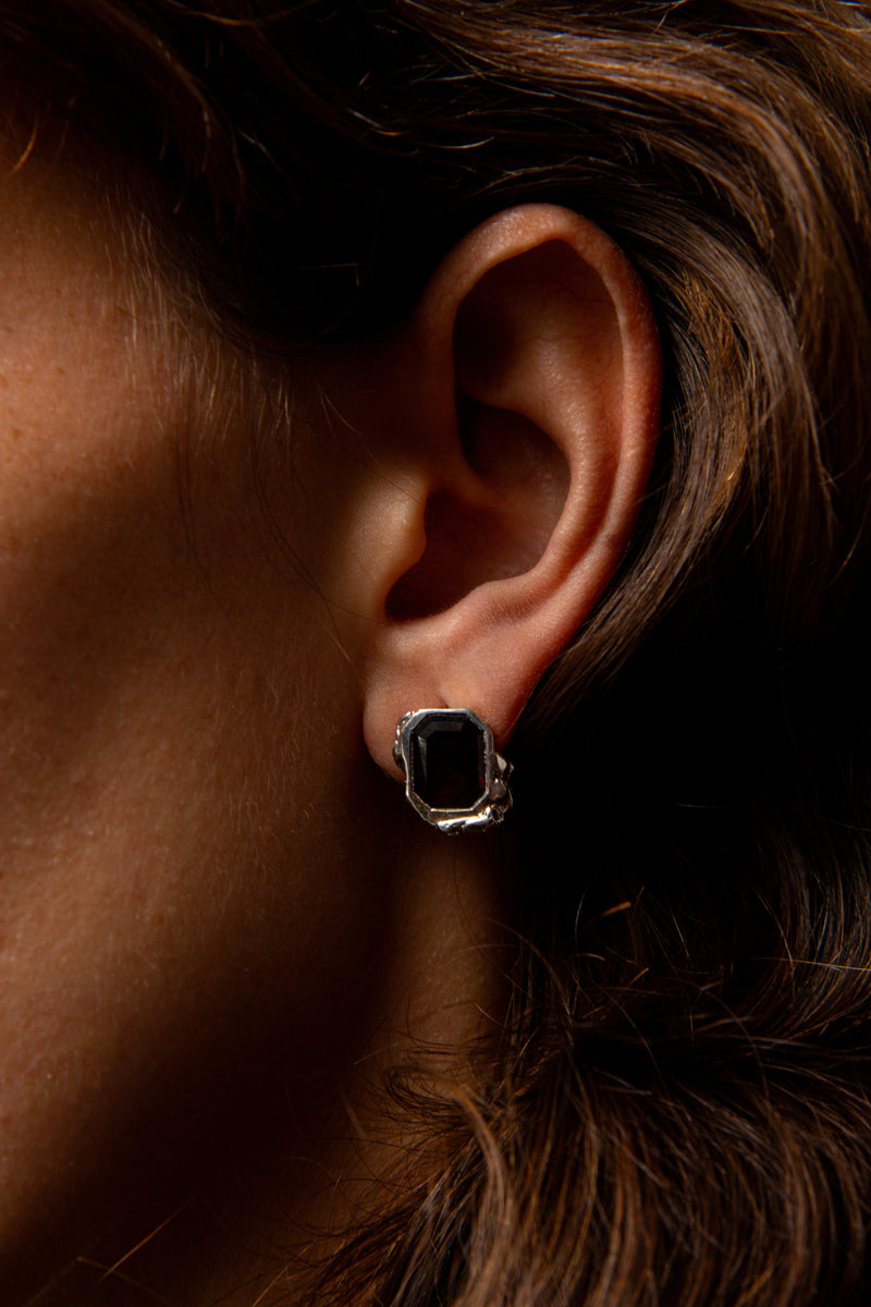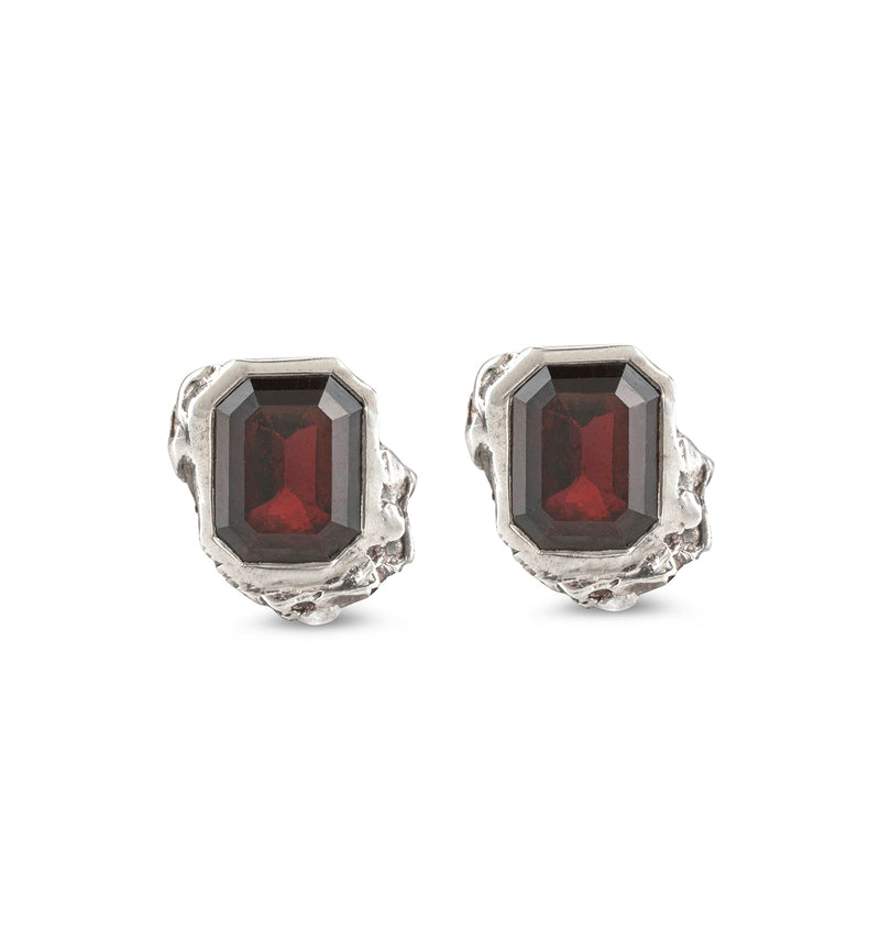 Stud earrings featuring a high-polish finish with asymmetric texture detailing set with emerald cut red garnet