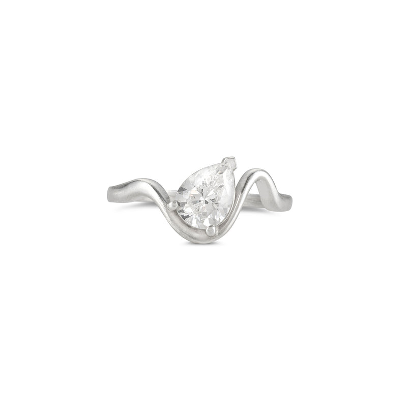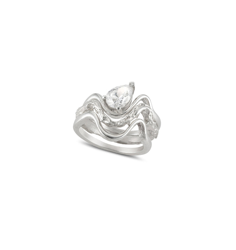 Asymmetric, high polished ring set with pear shaped zircon